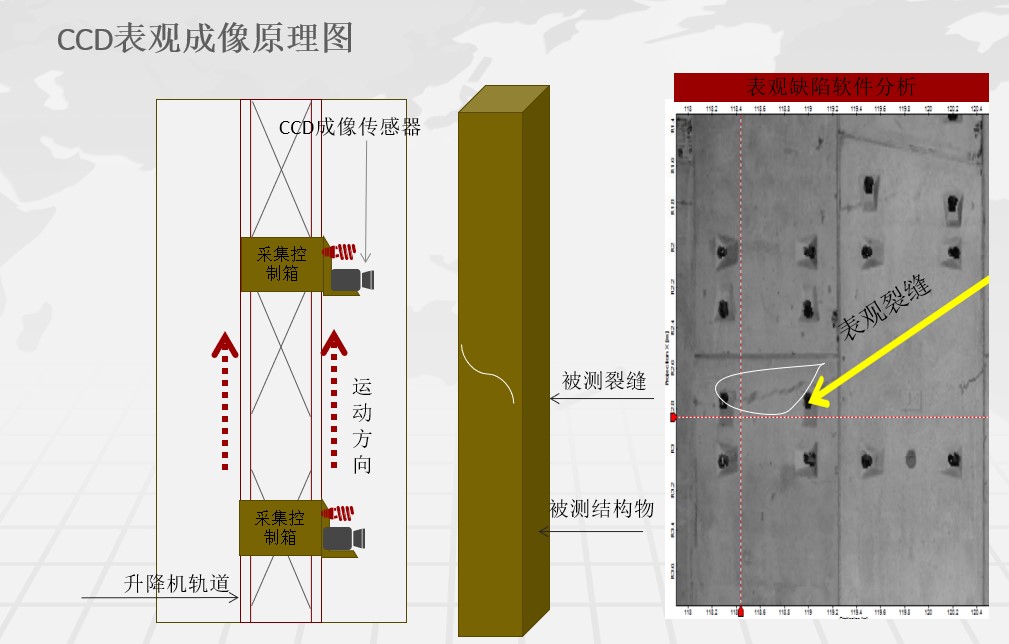 塔內(nèi)升降機可選配智能化檢測裝置,實現(xiàn)遠程操作對主塔內(nèi)砼結(jié)構(gòu)、錨索區(qū)等位置進行全自動掃描檢測,自動分析病害位置,大大降低了人工勞動強度,減少了人為因素檢測不到位或不實的情況,實現(xiàn)橋塔后期智能化檢測養(yǎng)護作業(yè)。