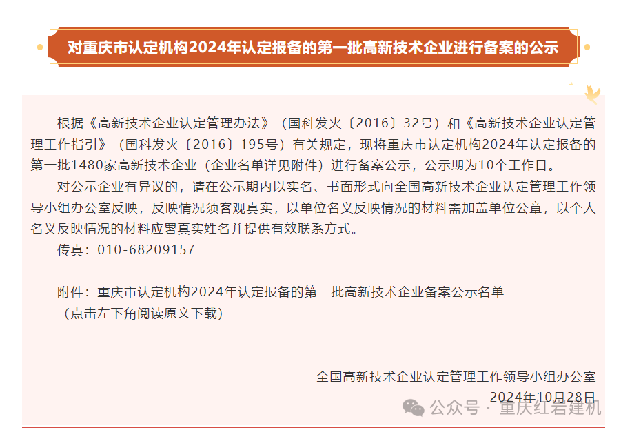 10月28日,全國高新技術(shù)企業(yè)認(rèn)定管理工作領(lǐng)導(dǎo)小組辦公室發(fā)布《對重慶市認(rèn)定機(jī)構(gòu)2024年認(rèn)定報備的第一批高新技術(shù)企業(yè)進(jìn)行備案的公示》,根據(jù)《高新技術(shù)企業(yè)認(rèn)定管理辦法》(國科發(fā)火〔2016〕32號)和《高新技術(shù)企業(yè)認(rèn)定管理工作指引》(國科發(fā)火〔2016〕195號)有關(guān)規(guī)定,對重慶市認(rèn)定機(jī)構(gòu)2024年認(rèn)定報備的第一批1480家高新技術(shù)企業(yè)進(jìn)行備案公示,我司名列其中,公示期為10個工作日。